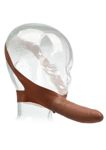 Ajakra felcsatolható latex pánttal ellátott latex dildó.